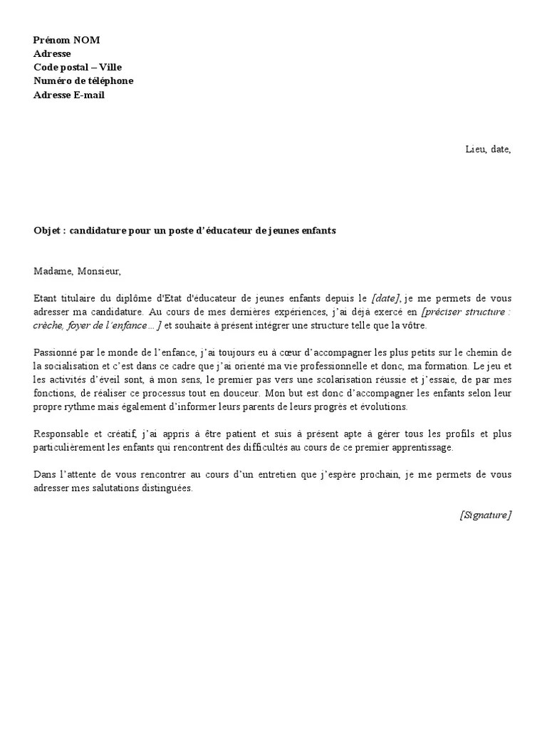 Madame, monsieur, ayant passé les concours d'éducateur spécialisé dans les écoles de st brieuc, brest et rennes, je suis actuellement à la recherche d'une structure afin d'effectuer ma formation en alternance. de plus, le métier d'éducateur sportif devrait profiter de la réforme des rythmes éducatifs. Titulaire du diplôme d'état d'eje obtenu en (date) à (préciser l'école), j'ai travaillé pendant quatre ans à. Candidature au poste d'éducateur sportif. Encore que la motivation puisse être motivée de manière intéroceptif, une société peut mettre en place le matière pour améliorer la coupe intrinsèque. Modèle de lettre de motivation gratuit pour un poste de educateur spécialisé en réponse à annonce, niveau débutant suite à votre annonce pour le poste d'éducateur spécialisé, je saisi la chance de déposer ma candidature auprès de vous madame, monsieur tout en. Adresser lettre de motivation et cv à monsieur le directeur @ : lettre de motivation licence science de l education modele de lettre Modèle de lettre de motivation gratuit pour un stage : Exemple lettre de motivation educateur specialise tout niveau. lettre de motivation mecsobjet : Lisez ce rapports de stage guide pratique et plus de 257 000 autres dissertation. La lettre de motivation ne doit pas dépasser une page.