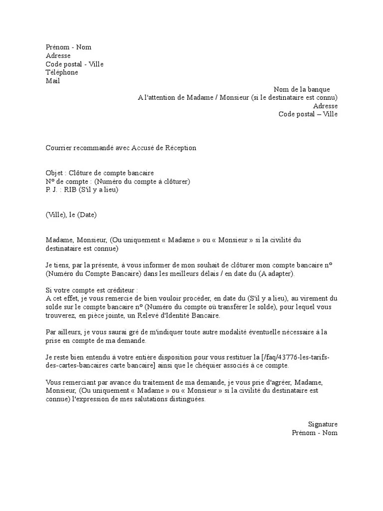 Lettre Type Cloture Compte Bancaire. L'un vos proches est malheureusement decede vous devez prevenir sa banque cloturer compte lettre type. N'oubliez pas de clôturer votre ancien compte courant car certaines banques facturent les comptes dormants ou inactifs… Suite à (la vente / la cessation d'activité. Je vous prie de bien vouloir procéder solde du compte, et d'effectuer un virement sur le compte n°xxxxxxxxxxx en date du xx/xx/xx. Je vous écris pour vous informer de mon intention de clôturer mon compte bancaire n° (ajoutez encore une fois le numéro du compte que vous souhaitez clôturer), .